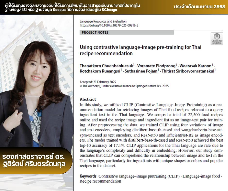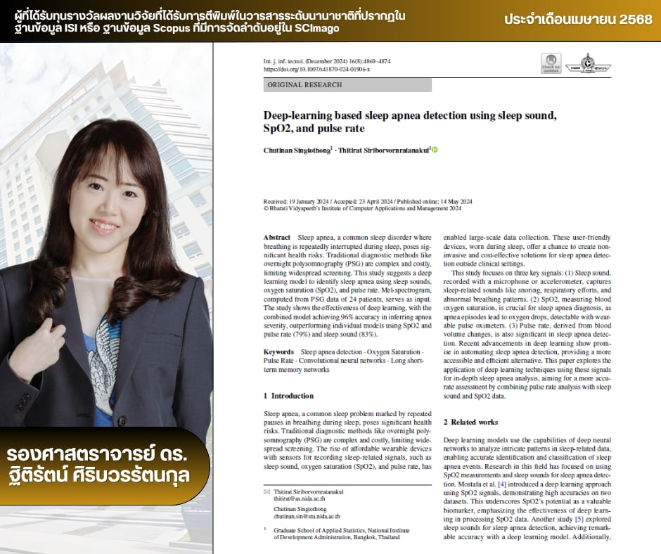 เรื่อง “Using contrastive language-image pre-training for Thai recipe recommendation” และ เรื่อง “Deep-learning based sleep apnea detection using sleep sound, SpO2, and pulse rate”