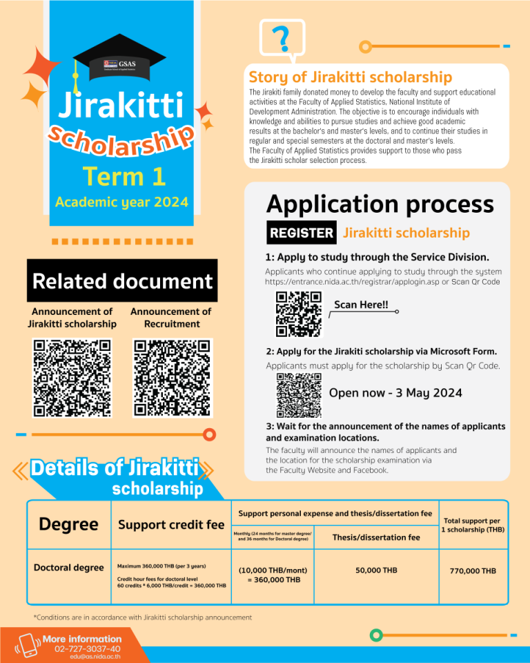 The Graduate School of Applied Statistics, the National Institute of Development Administration aims to support those who are knowledgeable, capable and possessing good academic standing at the bachelor’s and master’s degrees levels to further their studies at the doctoral and master’s degree (regular and special programs) levels. The School supports those who have passed the selection process of the “Jirakiti” scholarship fund