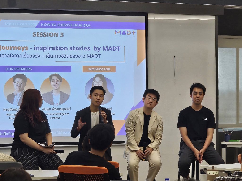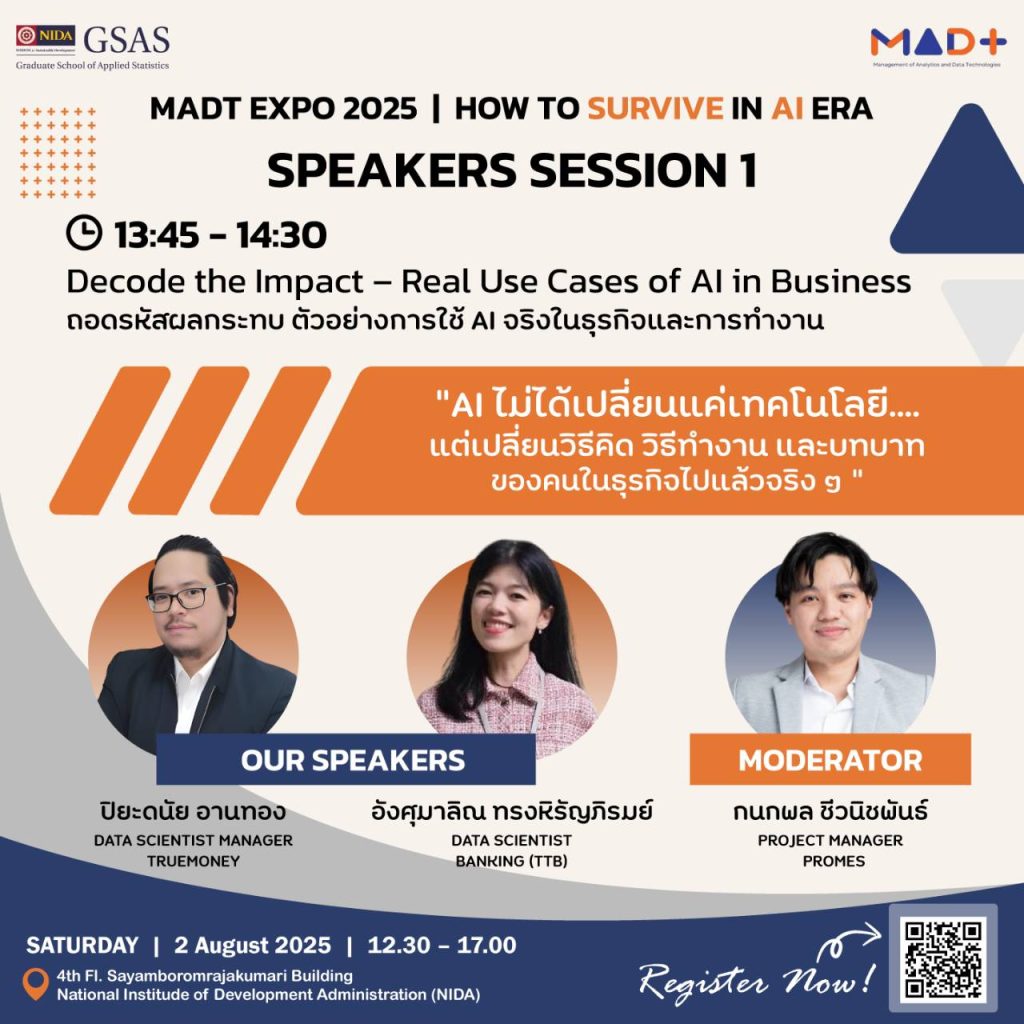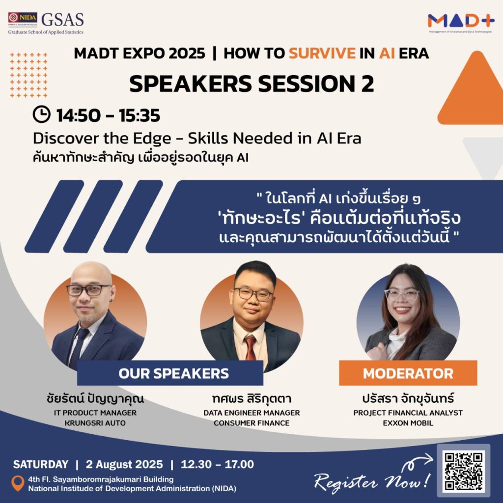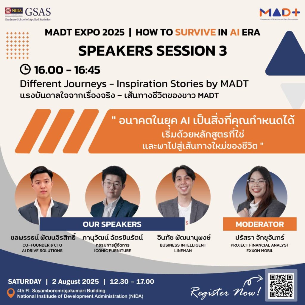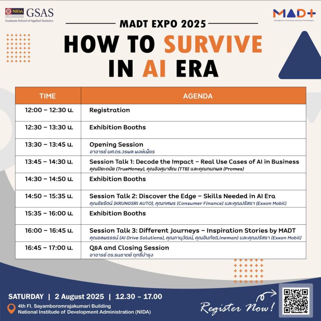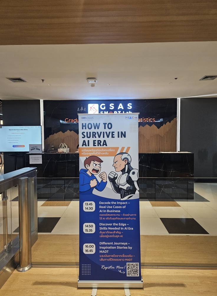 วันเสาร์ที่ 2 สิงหาคม 2568 นักศึกษาหลักสูตรการจัดการวิเคราะห์ข้อมูลและเทคโนโลยีข้อมูล (MADT) ได้จัดกิจกรรม MADT Expo 2025 ภายใต้แนวคิด “How to Survive in AI Era” ณ GSAS SM@RT Lab ชั้น 4 อาคารสยามบรมราชกุมารี สถาบันบัณฑิตพัฒนบริหารศาสตร์
