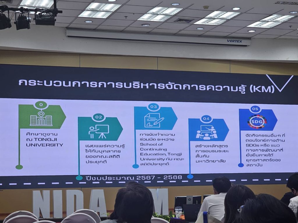 โดยนำสิ่งที่ได้เรียนรู้จากการไปศึกษาดูงาน ณ Tongji University สาธารณรัฐประชาชนจีน มาเผยแพร่ให้กับบุคลากรในคณะ และในอนาคตจะทำความร่วมมือระหว่าง School of Continuing กับคณะสถิติประยุกต์ เพื่อสร้างหลักสูตรอบรมระยะสั้นกับมหาวิทยาลัยอีกด้วย