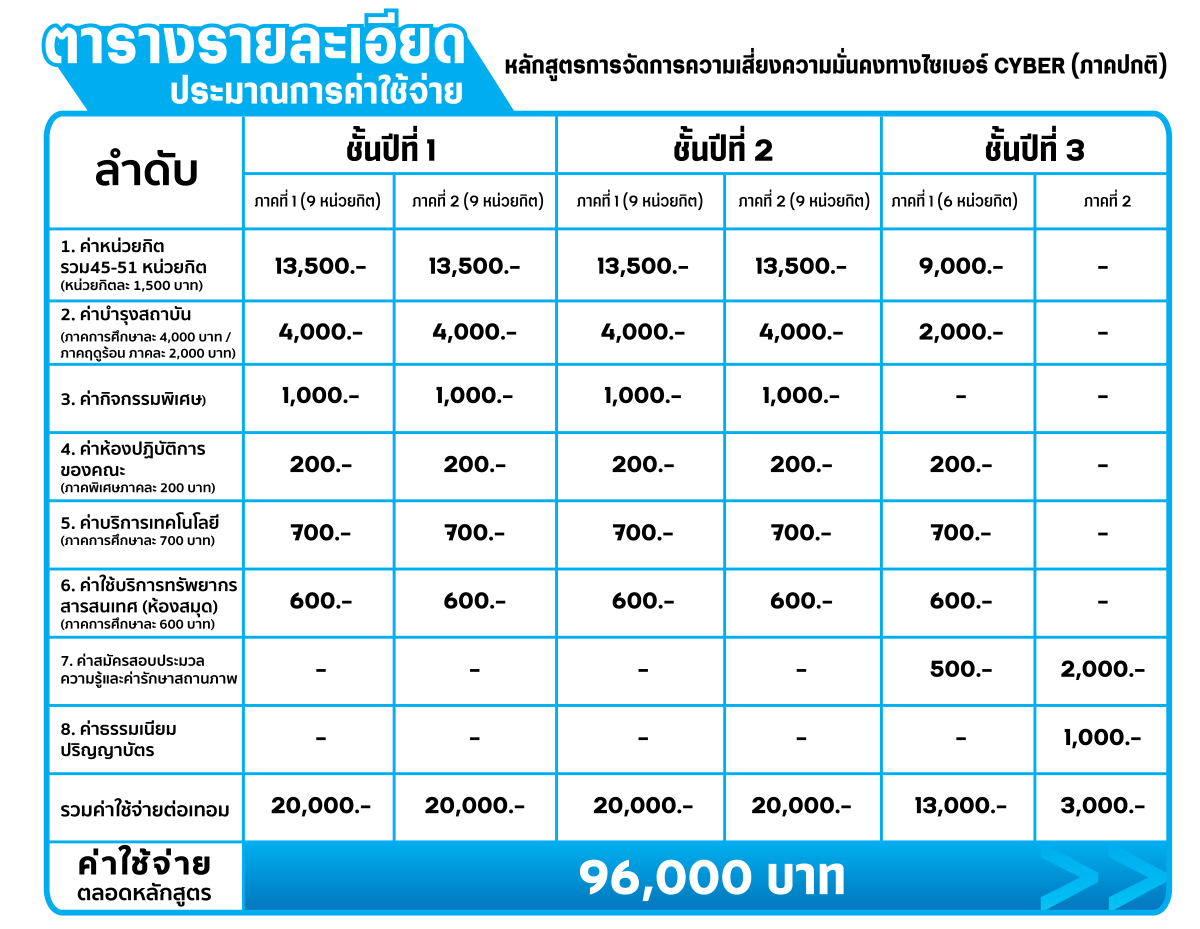 | สมซ 4002 | การปฏิบัติการความมั่นคงไซเบอร์ | 3(3 – 0 – 6) |