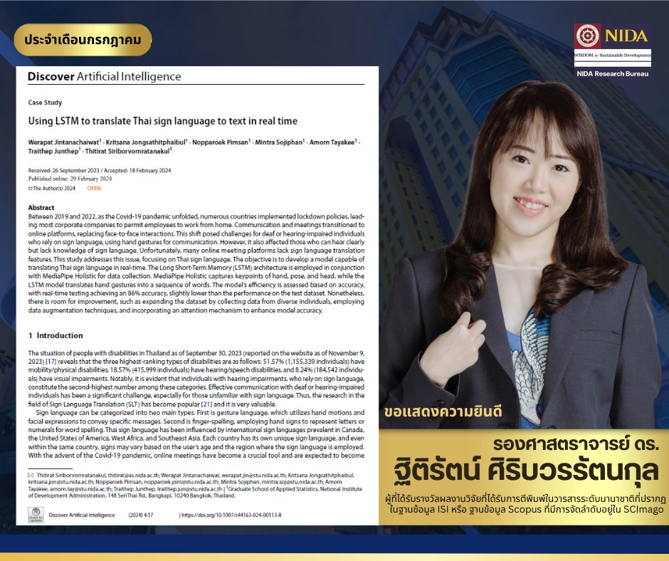 2. เรื่อง “Using LSTM to translate Thai sign language to text in real time” https://doi.org/10.1007/s44163-024-00113-8 1 ได้รับการตีพิมพ์Discover Artificial Intelligence สำนักพิมพ์ Springer อยู่ในฐานข้อมูล Scopus และจัดลำดับอยู่ใน SCImago ควอไทล์ที่ 1