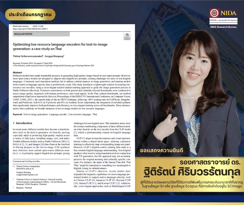 1. เรื่อง “Optimizing low-resource language encoders for text-to-image generation: A case study on Thai” https://doi.org/10.1007/s00530-025-01834-1 ได้รับการตีพิมพ์ใน Multimedia Systems สำนักพิมพ์ Springer อยู่ในฐานข้อมูล Scopus และจัดลำดับอยู่ใน SCImago ควอไทล์ที่ 1